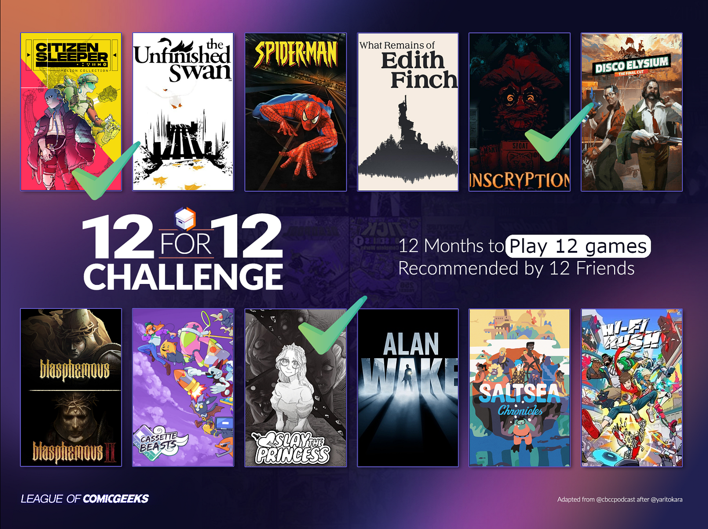 In my 2025 farewell post, I mentioned my plans for completing a “12 for 12” gaming challenge. There isn’t much more to it than playing 12 games recommended by friends within the next 12 months.